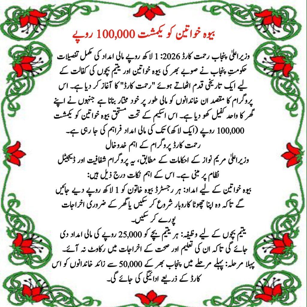 The Punjab government has allocated billions of rupees to ensure that widowed women are not left at the mercy of circumstances. The Rehmat Card serves as a specialized ATM card that allows beneficiaries to withdraw their grants directly. Unlike monthly stipends that barely cover utility bills, this program focuses on providing a significant one-time amount to help widows start small businesses or secure their household’s future.